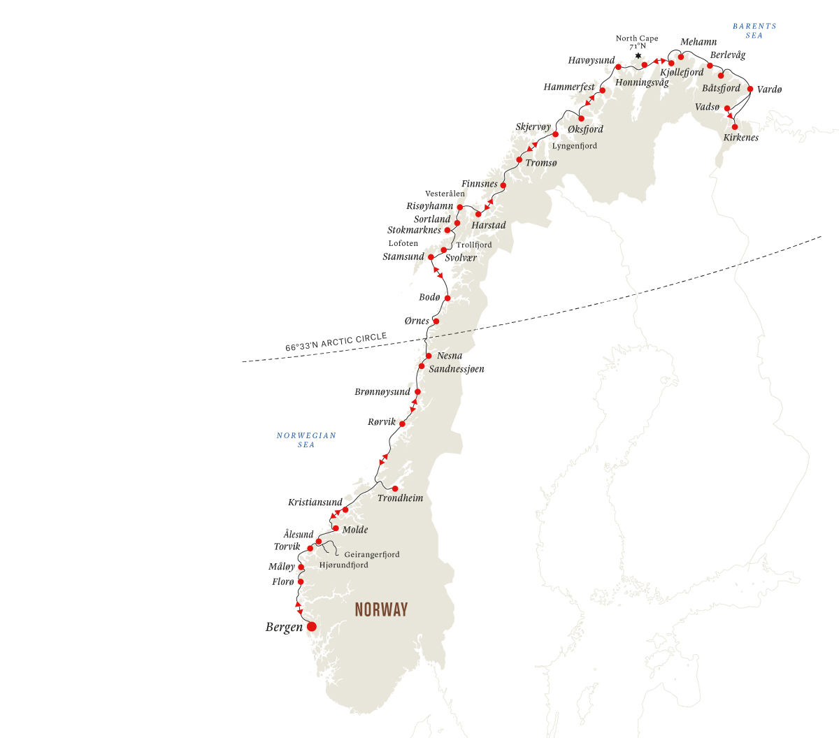 En kryssning längs norska kusten bjuder på några av Nordens mest spektakulära naturupplevelser. Längs resan möter ni dramatiska fjordar, små kustsamhällen och storslagna landskap där hav och fjäll möts. Fartygen följer den historiska kustrutten från Bergen i söder till Kirkenes i norr och tar er genom ett av världens vackraste kustlandskap. Under resan får ni uppleva både Norges rika kustkultur och den storslagna natur som gör denna resa till något alldeles extra.