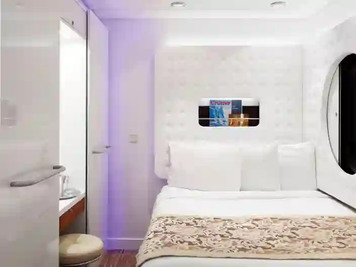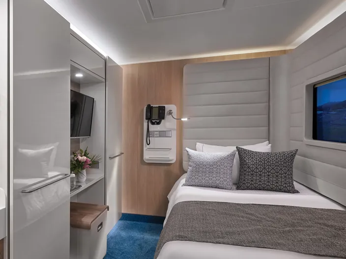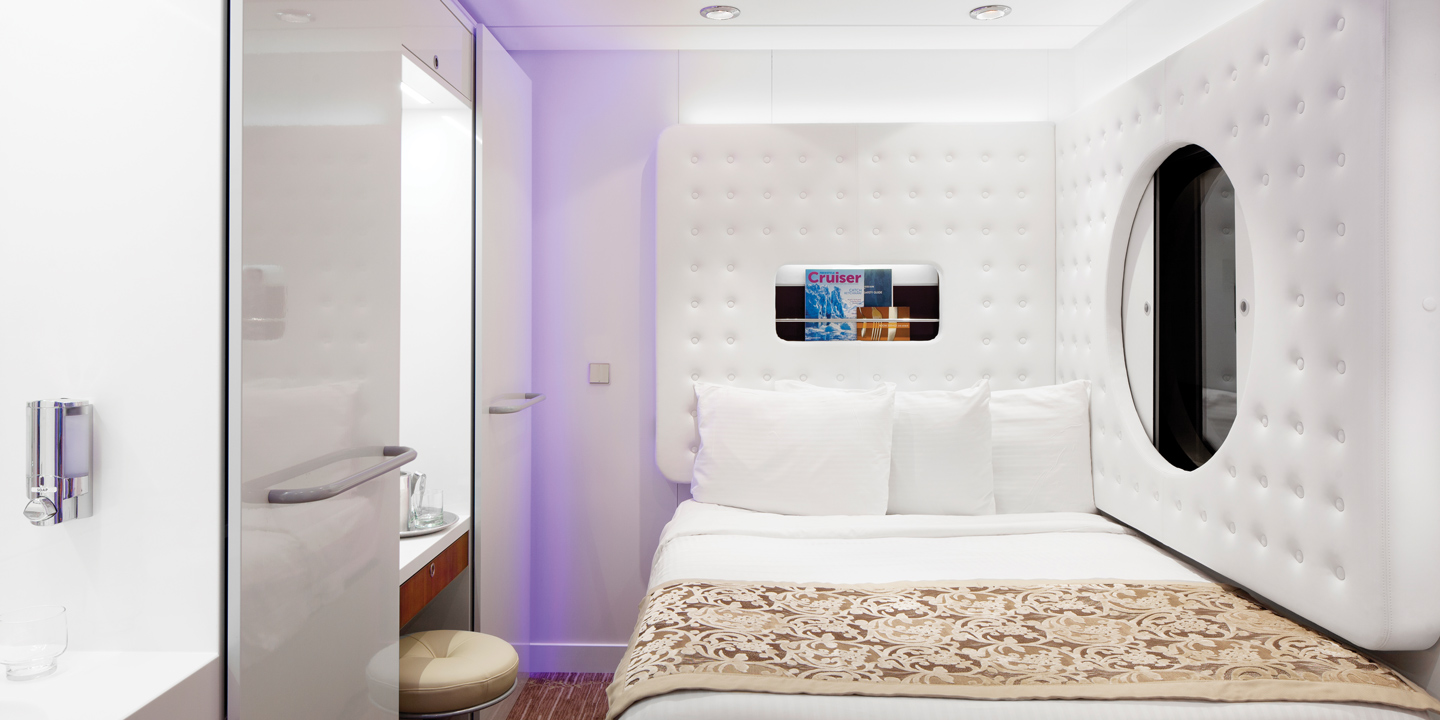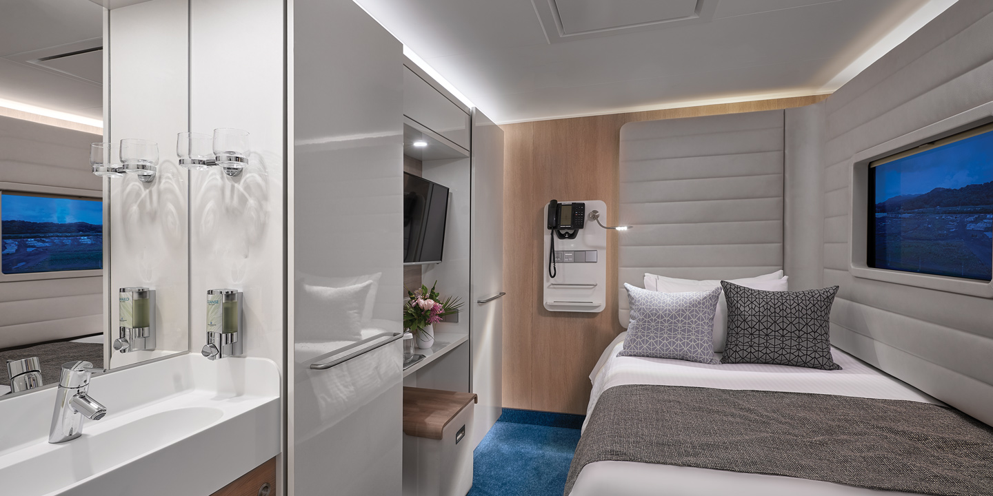 Studio-hytterna, som är förvånansvärt rymliga för att bara vara cirka 10 kvadratmeter stora, har alla nödvändigheter anpassade för en person. En fullstor säng, separat handfat och dusch, platt-TV, hårtork och ett kassaskåp. Här finns även ett stort enkelriktat hyttfönster mot korridoren, för att skapa ytterligare rymd.