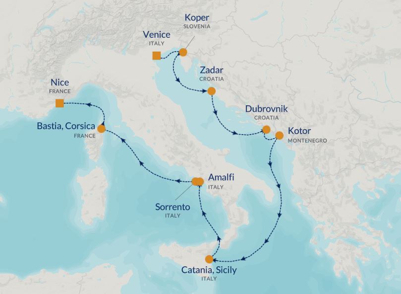 Kryssningen inleds i Venedigbukten, närmare bestämt i charmiga Chioggia, där vi har en övernattning innan vi kliver ombord. Chioggia är som ett litet mini-Venedig, med kanaler, broar, vackra gamla hus och mycket historia – men utan trängseln som råder inne i Venedig. Vårt första stopp blir sedan Koper i Slovenien innan vi beger oss mot Kroatien, där det blir en kort sejour i Zadar och Dubrovnik. Näst på tur gör vi ett besök i ett av Europas minsta länder, kulturrika Montenegro. Staden Kotor är rätt okänd för de flesta av oss, men det är en av de bäst bevarade medeltidsstäderna vid Adriatiska havet. Efter en dag till havs når vi sedan Italien igen, där en visit på Sicilien väntar innan den makalöst vackra Amalfikusten bjuder på två strandhugg, både Amalfi och Sorrento. Kryssningen avslutas med två stopp i Frankrike – Bastia på Korsika och Nice.
